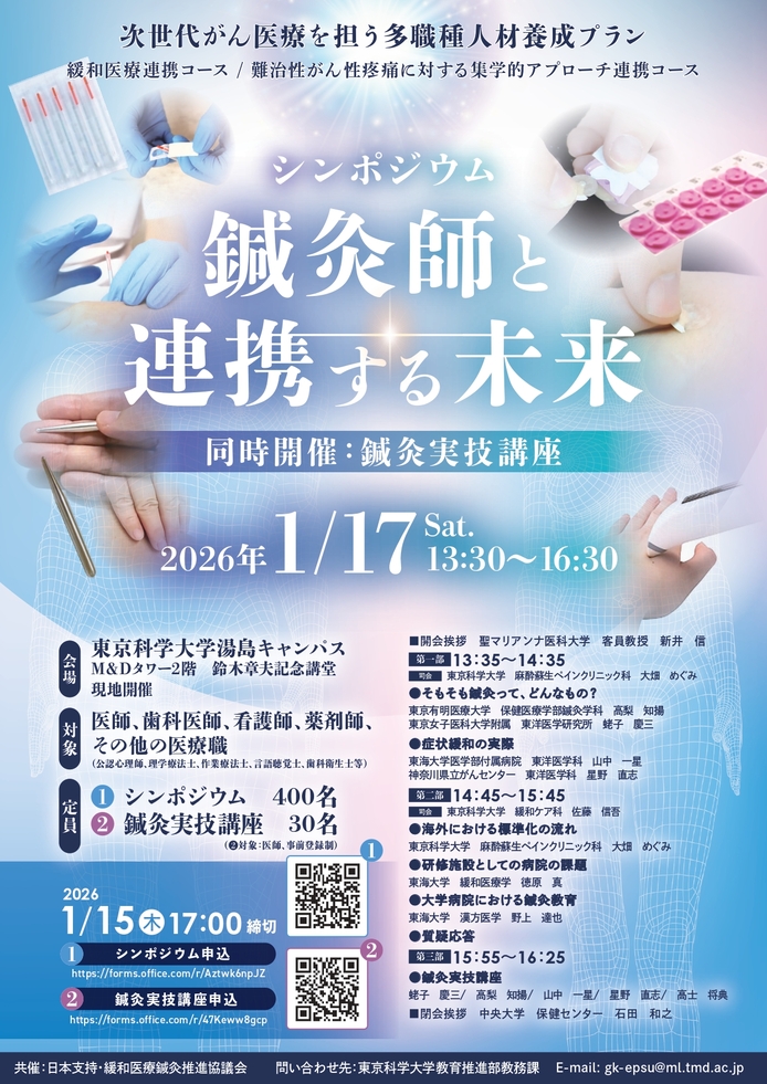 | 対象 | シンポジウム:医師、歯科医師、看護師、薬剤師、その他の医療職(公認心理師、理学療法士、作業療法士、言語聴覚士、歯科衛生士等) 鍼灸実技講座:医師 |