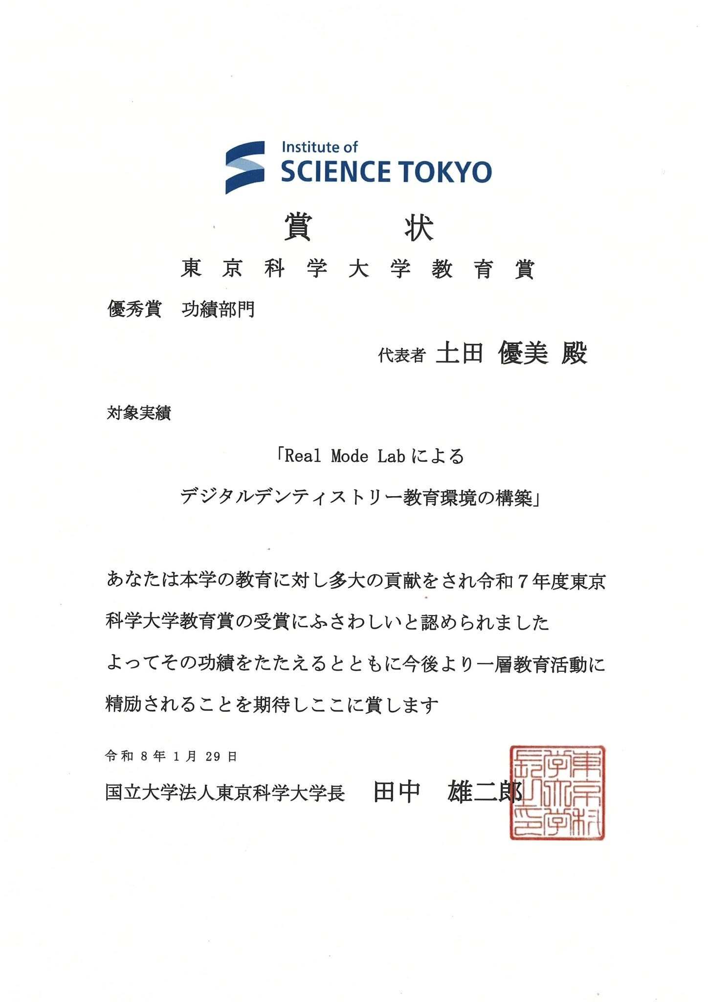 当分野の土田が、東京科学大学 第一回となる教育賞 功績部門の優秀賞を受賞しました。