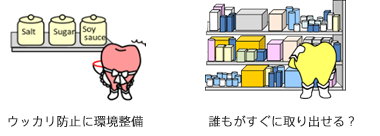 物の置き場所を明確にすることで、使用後に必ず元に戻されるようになる。よく似た物も一目でわかり、間違えにくい。
