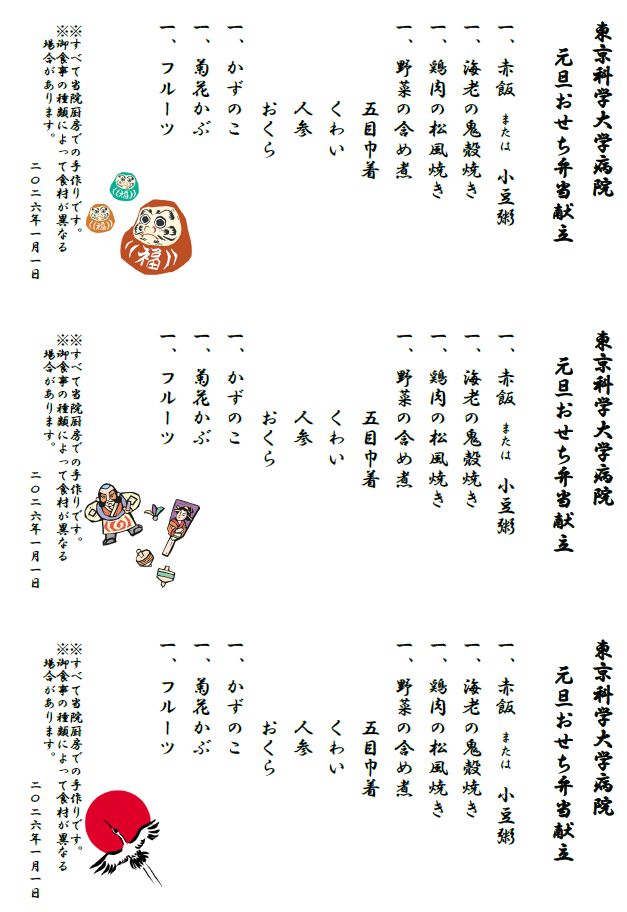 病気の治療のためお正月も入院生活を送られている患者さんに、少しでも新年の雰囲気を味わっていただきたい――そんな思いを込めて、東京科学大学病院臨床栄養部では、年末年始も出勤し、手作りの「元旦おせち弁当」を準備しました。