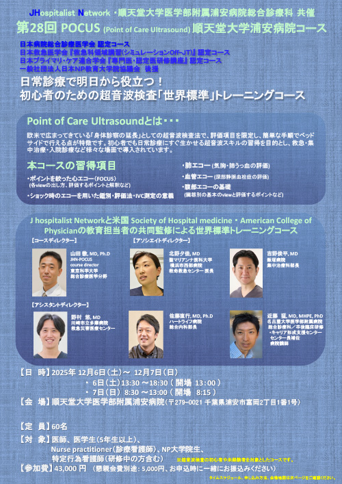 当科の山田講師がディレクターを務める JHN-POCUSコース が、12月6日・7日に 順天堂大学医学部附属浦安病院 と共催で開催されました。本コースは医師のみならず、NP(Nurse Practitioner) や 修了看護師(特定行為看護師) を対象とした多職種参加型のプログラムです。