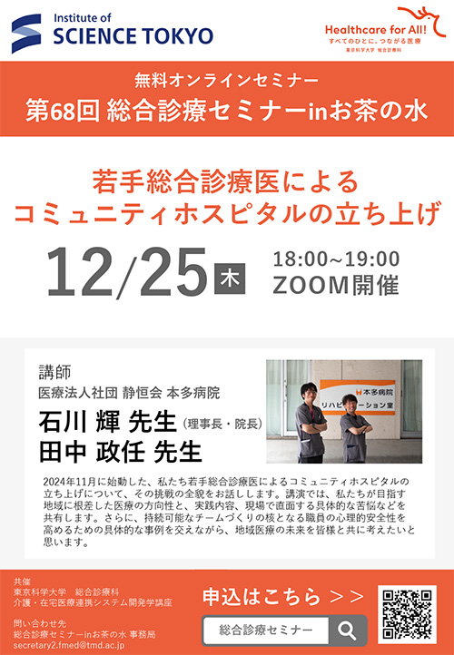 東京科学大学総合診療科では「総合診療セミナーinお茶の水」と題し、総合診療・プライマリケア領域に関連した勉強会を毎月開催いたします。日々の臨床に直結するトピックを厳選し、