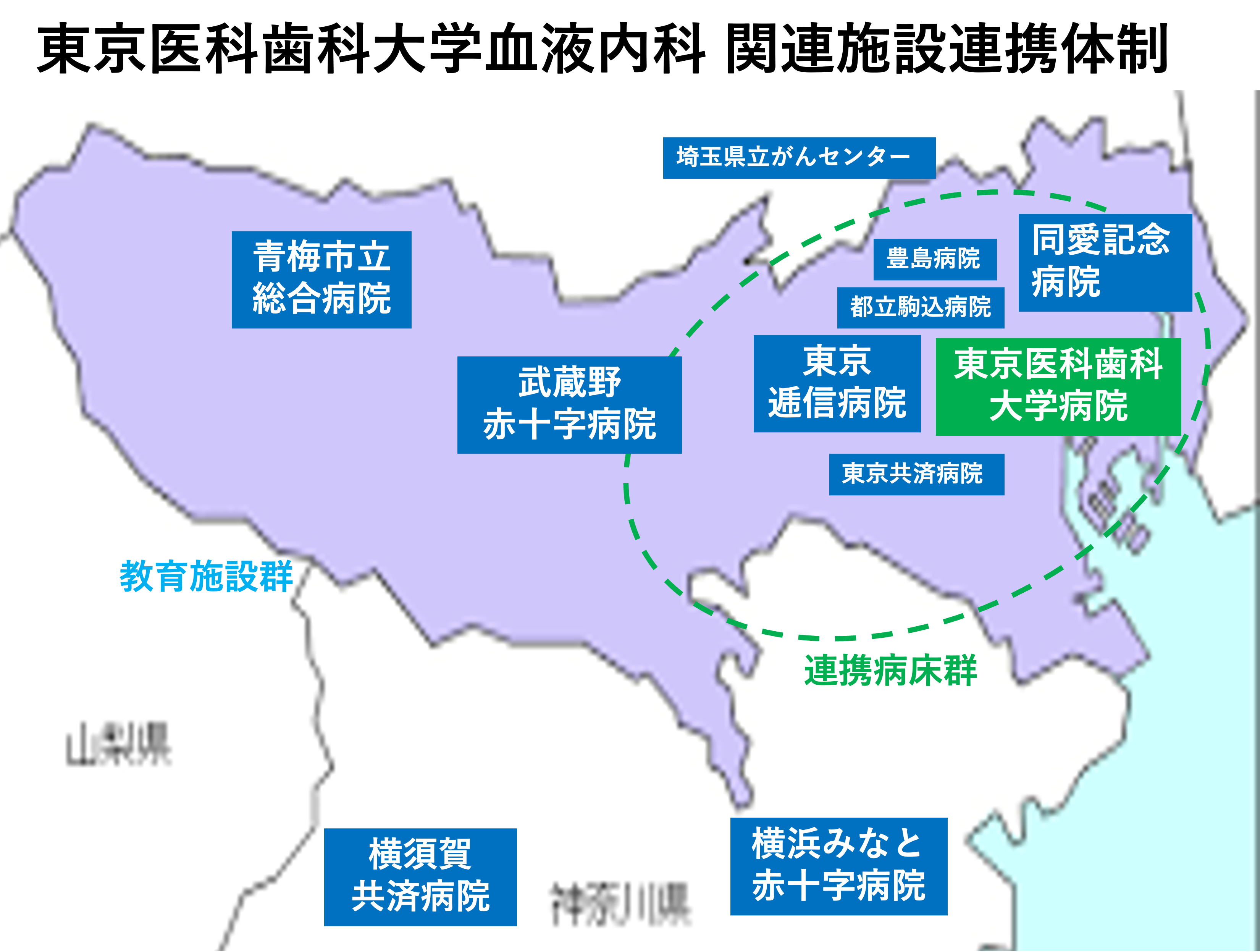 東京都外、及び都内遠隔地の施設との間では主に後期研修での連携(教育施設群)を、大学近隣の施設との間ではこれに加えて病床管理の連携(連携病床群)を行っています。いずれの施設も日本血液学会の専門研修施設であり、どの施設での研修を選んでも、最短で血液内科専門医の取得が可能です。