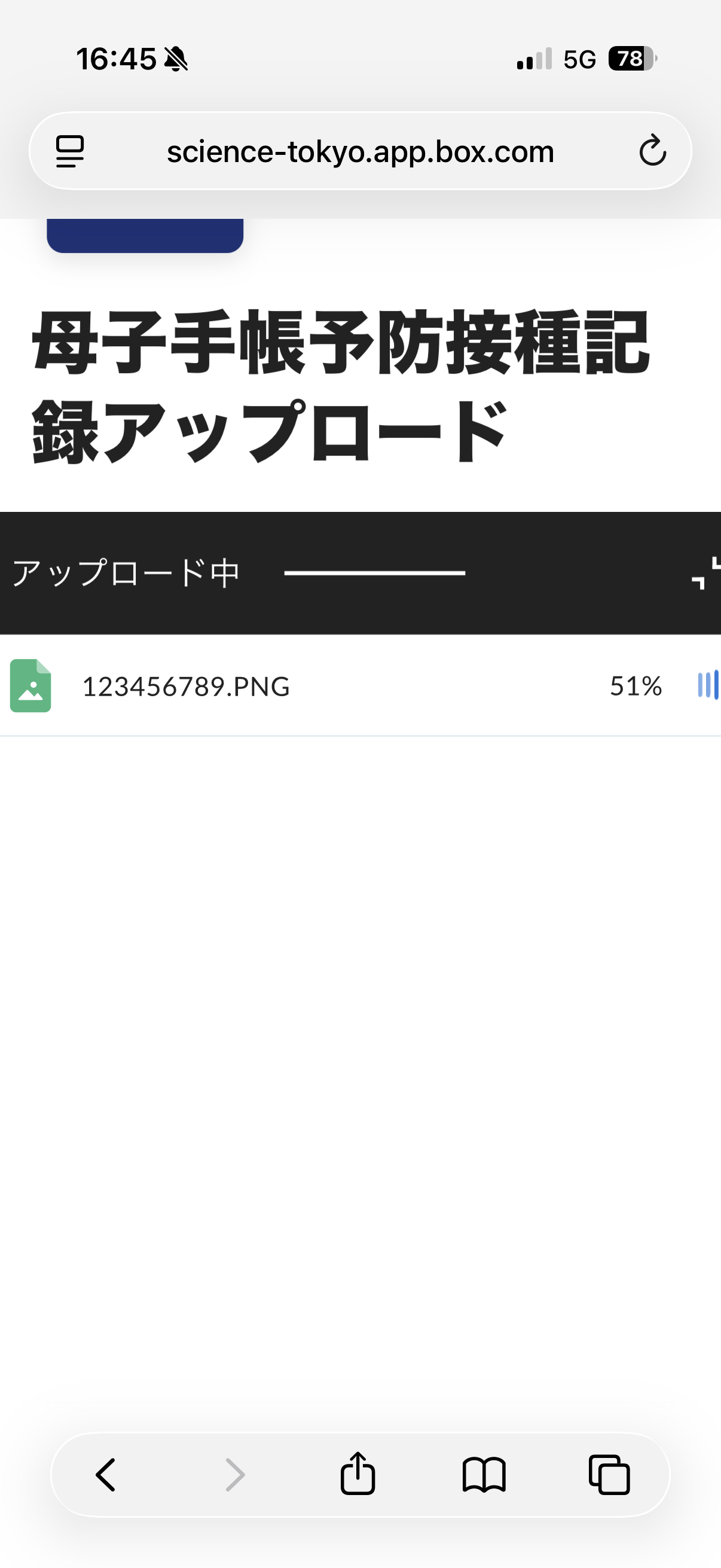 ・ファイルの大きさ、通信環境、BOXの不具合等によってアップロードに時間がかかる場合がございます。アップロード時の画面を以下に貼りますので、ご注意ください。