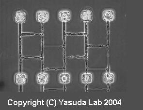 を立ち上げる実験を行ってきました。左の写真はアガロースゲルのマイクロチャンバー内で培養されるPC12細胞がチャンバー間を連結するように作られたマイクロトンネルを通してはしご状の2次元的神経ネットワークを形成している様子です。今後は、これまでに開発した新規技術の汎用に向けたキャリブレーションやさらなる技術開発などと並行して、実際の細胞培養と解析により何らかの生物学的知見を得ることを目標に研究室内の仲間と協力して研究を進めていく予定です。