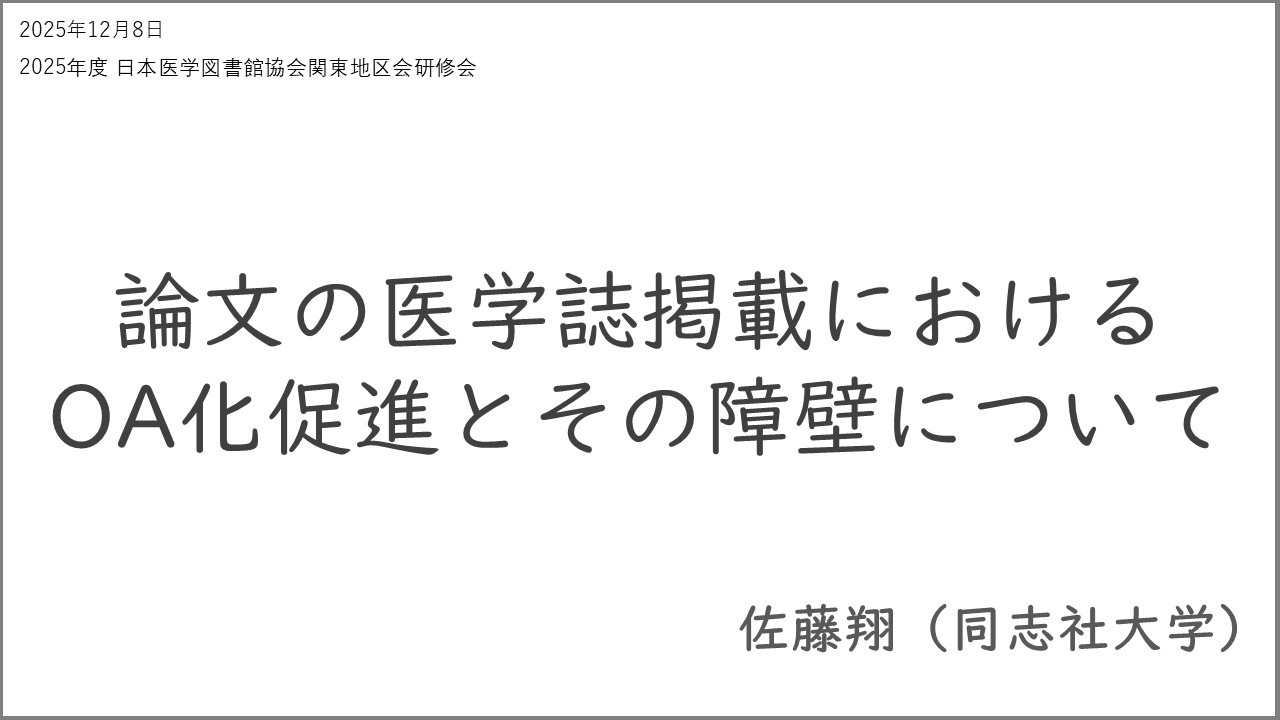 2025年度日本医学図書館協会関東地区研修会 研修会動画 研修会資料 2025年12月8日に行われた研修会の動画像と資料です。 公開は2026年3月31日までです。 研修会動画 画像をクリックしてください 研修会資料 JMLA_Kanto_2025