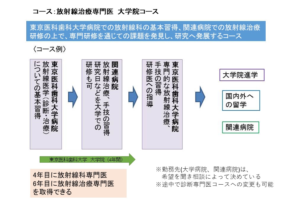 - 放射線科では積極的に大学院生を受け入れている。研究を中心に行う大学院コースや専門医取得後に放射線科研修を行いながら大学院博士取得を目指す社会人大学院コースを用意している。