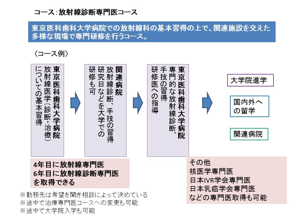 当放射線科での卒後研修の特徴は診断、治療、核医学のバランスのとれた研修ができ、本人の専攻が十分研修した後に決定できるところである。初期研修終了後、東京科学大学病院での放射線科の基本習得の上で、関連施設を交えた多様な現場で専門研修を行うことができる。1年目は診断(頭部、胸部、腹部、IVR、核医学)、治療をローテーションして研修するが、興味のある分野ははじめから重点的に研修することが可能である。2年目以降は本人の希望する領域を中心に院内、院外の教育病院での研修を継続する。現在は放射線科以外の領域(病理、解剖学など)他科での短期研修をプログラムに取り入れることを検討している。