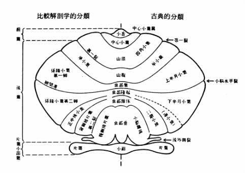 図11−18 小脳の古典的分類(右)と比較解剖学的分類(左)の比較。 小脳を後方から見た模式図(Larsell Jansen改変)。