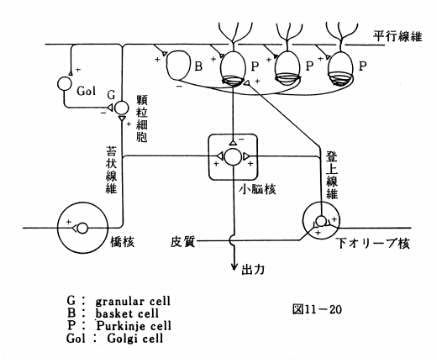 図11−20  G:顆粒細胞 B:篭細胞 P:プルキンエ細胞 Gol:ゴルジ細胞