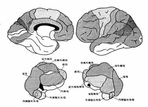 図11−21 視床皮質結合の模式図。各視床核(下)はそれと同じ模様の大脳 皮質の領域(上)と結合する。左は上下とも内側面。白い部分は視床皮質結合に 乏しい領域。黒は線維系。