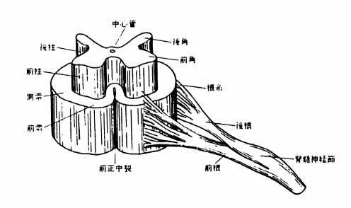 図11−4 脊髄(頚髄)の灰白柱と白質ならびに前根と後根を示す模式図。 上部では白質を除去し、灰白柱のみを示してある。