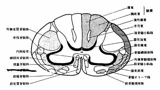 図11−7a 脊髄(頚髄)横断面における伝導路。下行路は左側に、上行路およ びその他の経路は右側に説明を付した。固有束は黒で示した。