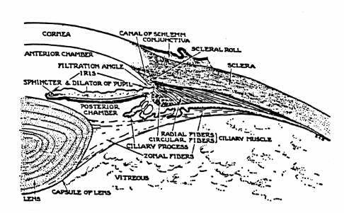 図13−4 ヒトの眼の anterior ment の詳細図。毛様体突起は切断面上でゆ がめられている。Scleral roll はScleral細胞のせまいたなで、毛様体筋の放射 状線維あるいは輪状線維の下側にある。(After Bloom and Fawcett, A textbook of histology, Philadelphia, W.B.Saunders Co., 1962.)