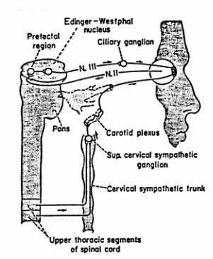 図13−7 眼の自律神経支配。対光反射の経路も示す。(Modified from Ranson and Clark: Anatomy of the Nervous System).