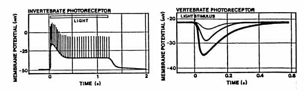 図14−11 無脊椎動物と脊椎動物の光受容器の受容器電位の比較。左:カ ブトガニの光受容器の反応。光は受容器を脱分極させ、刺激期間中インパルス を引き起こした。無脊椎動物の光受容器は、ゆっくり適応する脊椎動物の機械 受容器の反応と同じタイプである。右:3種類の強さの短期間フラッシュに対 するカメの網膜の一個の錐体反応。脊椎動物の光受容器は、光に反応して段階 的な過分極を示し、スパイクを発生しない。(Left part from Fuortes and Po- ggio, J.Gen. Physiol., 46,1963; right part from Bayylor and Fuortes,J. Physiol., 207,1970.)