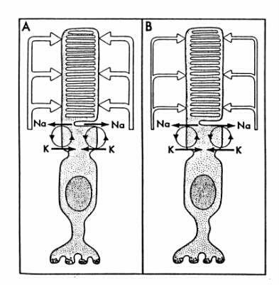 図14−12 脊椎動物の光受容器の暗電流と光照射中の過分極反応の概要を 説明する模式図。(A)暗所では、Na電流は外の部分の形質膜を介して流れ る。(B)光が受容器を照らすと、膜のNa透過性は減少し、Naの流入が減 った。