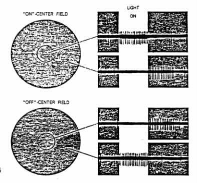 図14−14 コンセントリックフィールドは網膜神経節細胞と膝状細胞の特 徴である。上の記録は、光スポットが受容野の中心に当たったときの、オン中 央型細胞の強い発射を示す;スポットがオフ領域に当たったときは、発射は光 が当たっている間抑えられている。下の図は、オフ中心型の別の細胞の反応。