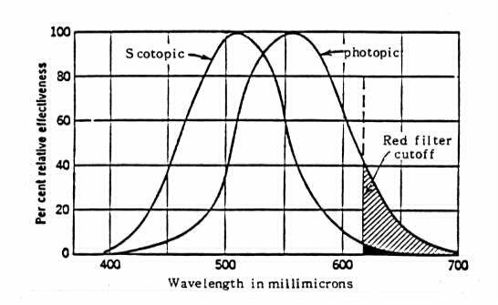 図14−4 暗所視(桿体)と明所視(錐体)の明度曲線。最大値が任意に 100 と設定したので、曲線は、桿体と錐体の相対的感度についての情報は持たない。 垂直線は赤フィルターでカットした場所を表す。それは、錐体曲線に含まれる光 を1/10に変換し、桿体曲線のそれは1/100に変換する。(Hecht and Yun Hsia 1945.)