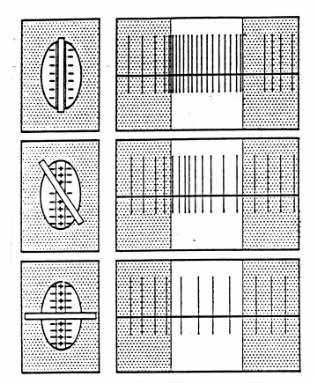 図15−3 垂直線は、せまい光のスリットに対する単純細胞の反応。最適の活 動は受容野の中心領域の中に垂直方向を向いたスリット光があるときに生じた。 スリット光が他の方向を向いているときは、反応は弱くなった。(Adapted from Hubel and Wiesel,J.Physiol.,148,1959.)