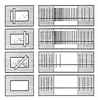 図15−5 複雑細胞の反応の特徴。受容野はオン領域とオフ領域がはっきり しない。細胞は。垂直スリットかその縁によく反応する。受容野内の光刺激の 位置は、比較的重要ではなく、刺激の方向が決定的要因。受容野全体の刺激は 何の反応も示さない。(After Hubel and Wiesel, J.Physiol.,160.1962.)