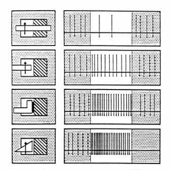 図15−6 18野の極端複雑細胞の反応の特徴。この細胞は、長く白いスリ ットが受容野を横切って動くときは反応せず、スリットが短く受容野とは反対 方向の右側へ伸びているときは反応した。より強い反応は、左側方向が受容野 のこの方向での角あるいは角度のあるものが動くことによって刺激されたとき 生じる。(After Hubel and Wiesel,J.Neuurophysiol., 28,1965.)