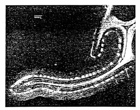 図15−7 オートラジオグラフィの技術を使って見えるようにした、サルの視 覚皮質の眼球優位性の柱。放射性ラベルをされたアミノ酸を右眼に注入した。ア ミノ酸は外側膝状体を通って視覚皮質の細胞へ輸送される。ラベルされた領域は 左眼よりも右眼により活発に反応する細胞の柱として表れた。明るい部分を断片 的に分割している暗い領域は、左眼により支配されている細胞の柱を示している。 (From Hubel, The Hubel, The Harvey Lectures, Academic Perss,1978.)