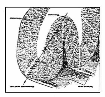 図15−8 視覚皮質の方位の柱。視覚皮質から微小電極で記録して得られた 典型的な結果の図解表示。電極の進路上の点は一つの細胞を表し、点を通って 描かれた線は、細胞のうけもつ方向を表す。おのおのの柱において全ての細胞 は、同じ方向支配している。あるコラムから別のコラムへ電極が貫通すると、 突然方向の指向性が変化する。(From Blakemore, in Handbook of Psychobiol- ogy, Academic Pres,1975.)