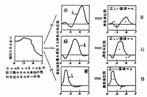 図17−3 混合曲線と分光測定値から、三刺激表示を計算するために用いる積 分過程を示す図。