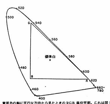 図17-5 青原色の軸に平行な方向から見たときのRGB単位平面。これは 図174の線形投影である。