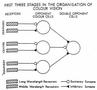 図17−9 色覚の組織の最初の3つの段階。この例の受容器シナプス色反対細 胞は on L’−M 反応を持っている。この例の二重反対細胞にシナプスでつ ながってる色反対細胞は、受容野の中心に L’−M 反応を持っており、周辺に on L−M’反応を持っている。いくらかの種では(例えば、goldfish)、受 容器は直接色反対細胞にシナプスし、色反対細胞が直接二重反対細胞にシナプス してる。他の種では(例えば、マカクザル)、介在細胞がある。