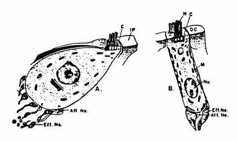 図18−17 (A)内有毛細胞と(B)外有毛細胞の相対的形。C,基底小体 ;Aff.NE,求心性神経終末;Eff.NE,遠心性神経終末;IP,内柱 (inner pillar) ;DC,外側細胞 (deiters cell) ;M,ミトコンドリア; Nu,核 (Wersall, Flock and Lundquist,1965)