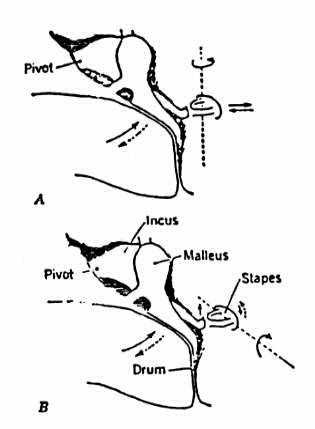 図18−4 アブミ骨の振動の2つのモード。A,それの遠い縁を通る垂直軸に そった足板の回転は、弱い音に反応して生じる。流動体はreaderの近くのアブミ 骨の縁の動きによって、前庭階の中に押し込まれる。B,知覚のいき値以上の強 さでは、回転軸は足板の縦軸と一致し、階に押し込まれた流動体の実際の量は減 少する。(Bekesy, 1936c.)