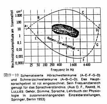 ¿Ş£±£¹¡İ£±£°¡¡Schmatisierte Horschwellenkurve (A-E-F-G-D)und Schmerzschw- ellenkurve (A-B-C-D). Das Hauptsprachgebiet ist rot eingezeichnet. (Aus O.F.,RANKE.HLULLIES:Gehor, Stimme, Sprache, Lehrbuch der Physiologie in zusammenhangenden Einzeldarstellungen. Springer, Berlin 1953)