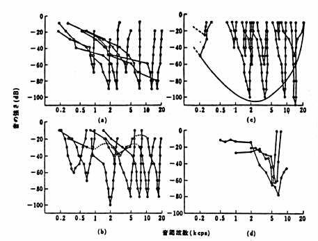 図19-3 蝿牛神経(a),鍋牛神経核(b),下丘(c),内側膝状体(d)にて記録された 単一ニューロンの応答野