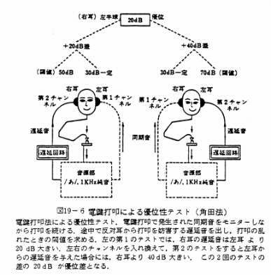 図19−6 電鍵打叩による優位性テスト(角田法) 電鍵打叩法による優位性テスト電鍵打叩で発生された同期音をモニターしながら 打叩を続ける。途中で反対耳から打叩を妨害する遅延音を出し、打叩の乱れたと きの域値を求める。左の第1のテストでは、右耳の遅延音は左耳より20dB大 きい。左右のチャンネルを入れ換えて、第2のテストをすると左耳からの遅延音 を与えた場合には、石耳より40dB大きい。この2回のテストの差の20dB が優位差となる。