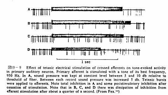 図19−9 一次聴覚ニュ−ロンの調子で引き起こされる活動に対する、交叉性 遠心神経の強縮電気刺激の効果。一次求心神経は、それの最適の頻度950Hz の調子で刺激された。A:音圧は神経線維のいき値に関係ある5から10dbの 間の一定のレベルに保った。各々の記録の間で、音圧は5db増えた。強縮破裂 は遠心神経に与えられた。Aのトータルの抑制と刺激の停止後の刺激後抑制に注 意せよ。B,C,Dでは、約1/4秒後の遠心神経刺激から抑制の消失があるこ とに注意せよ。(From Fex.)