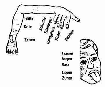 ¿Ş£²£²¡İ£±£±¡¡Somatotopische Gliederung des Gyrus postcentralis beim Menschen (sensibler Homunculus).(Nach LANGLEY u.CHARASKIN:Physiology of man.New York 1954.)