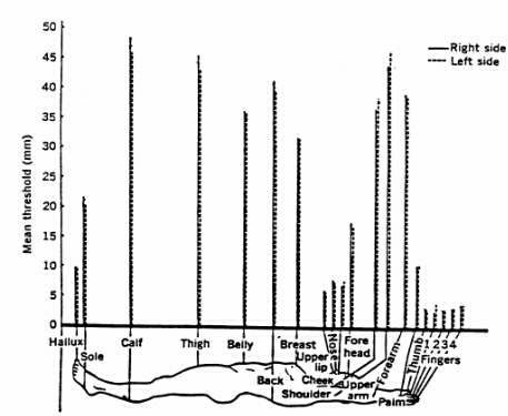 図22−3 ヒト男性体表面の異なる部位での2点の弁別の閾値。(From Weinstein.)