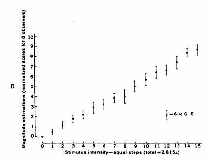 ¿Ş£²£²¡İ£´£Â¡¡Result of psychophysical experiment in humans in which subjects are asked to rate stimuli along intensive continuum by assigning number to them. Stimulator rsed and experimental arrangements otherwise similar to experiment on monkey hand. Ponints are means for numbers called by eight healthy young adults after normalization of individual subjective scales. Relation obviously linear. Implication is that all those neural transformations that intervene between neural input and final verbal description of magnitude estimation are in sum linear. Second important implication is that human relation to external world as regards intensity of sensory stimuli is set by properties of periphe- ral receptors.(A From Mountcastle et al.)