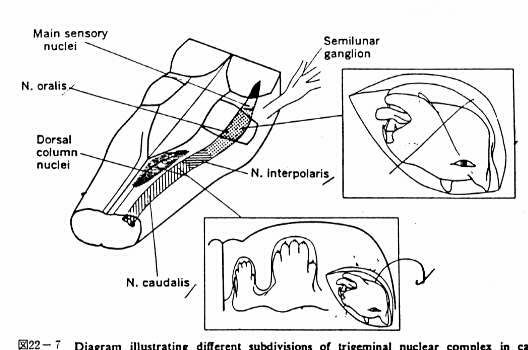 図22−7 ネコの trigeminal nuclear complex の異なる部分の模式図とそれ ら構成要素内の体部位局在的投射。反対側側面の顔の各々の領域は、体部位局在 性を欠いている interpolaris 核を除いて、complex の中にすべてのrostrocau- dal のレベルで中心に再現されている。投射のパターンは、2とおりある。反対 側側面の手足とDCNへの幹と顔から尾上核への投射は juxapose されているが 連続的ではない。