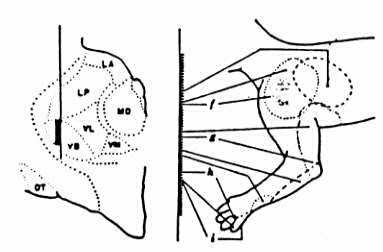 図22−9 左側にある視床の横断面の垂直線は、視床に刺した記録電極の通り 道を示している。厚い黒い部分は、VBからのニュ−ロンで拡大図のまん中に示 した。視床のこの部分は、皮膚の限られた部分内での刺激を感受する細胞を持っ ている。ネコの領域f,g,iは、メカニカルタッチの光で刺激した。爪先関節 のゆるやかな回転に反応するA細胞は、hで発見された。他の核群:LA,前外 側核;LP,後外側核;MD,背内側核;VM,腹内側核;OT,光束を再現 (Poggio and Mountcastle,1960.)