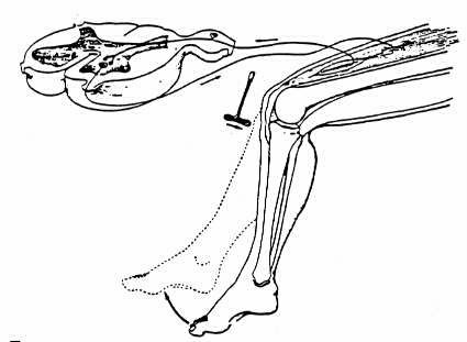 図26−2A 伸張反射の脊髄経路。膝蓋腱をたたくと、quadriceps femoris 筋とこの筋の中の筋紡錘の短期間の伸張がおこる。紡錘の一次終末は、quadri- ceps 筋の運動ニュ−ロンへ単シナプス的に伝達される短期間の発火に反応し、 膝蓋腱反射を引き起こす。