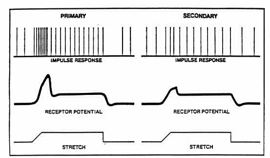 図27−4 哺乳動物の筋紡錘の一次および2次終末の反応特性。インパルス発 火の特徴と、2つのタイプの終末の受容器電位の間には密接な関係がある。(Ada- pted from Hunt and Ottoson,J.Physiol.,252,1975)