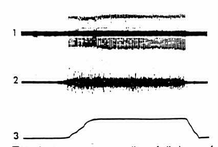 図27−8 ヒトの求心性筋紡錘の発火(上図)と、指の筋肉の任意的な収縮 (中央図)の同時記録。一番下のトレースは、指の動き。収縮は求心性紡錘の 発火のわずか前で始まり、紡錘運動活動により引き起こされない活動を引き起 こす。(From Vallbo,Acta Physiol.,78,1970.)