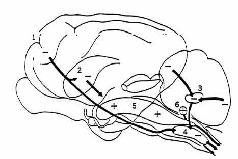 図28−1 抑制と痙縮に関する促進システムを示すネコの脳の再構成。抑制 経路は、1,pericruciate 皮質に起源を発する corticobulboreticular ;2, caudatospinal(probably caudatoreticulospinal);3,小脳網様cerebellore- ticular(前頭葉と正中傍小葉から発し、室頂核に中継している);4,網様脊 髄。促進経路は、5,網様脊髄と、6,前庭脊髄 (From Lindsley et al.)