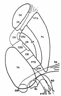図32−1 右側内包の線維構成を示す模式図(水平断)。Cd,尾上核; CN,皮質核線維;CR,皮質赤核路;CRe,皮質網様体線維;CSI, 皮質脊髄線維(おもに下肢に接続);CSS,皮質脊髄線維(おもに上肢に 接続);FP,前頭橋路;GL,外側膝状体核;GM,内側膝状体核;GP, 淡蒼球;OTP,後頭、側頭および頭頂橋路;PTA,前視床脚;PTP, 後視床脚;PTS,上視床脚;Pu,被殻;RA,聴放線;RO,視放線; Th,視床。