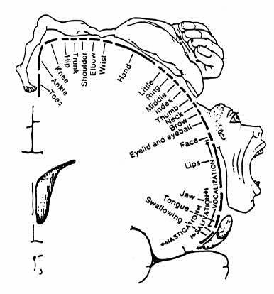 図32−3 ヒトの一次運動皮質の様々な場所の相対的サイズを示す図。電気 刺激により、体の異なる場所の動きが生じる。(From Penfield and Rasmussen, The Cerebral Cortex of Man, New York,1950.)