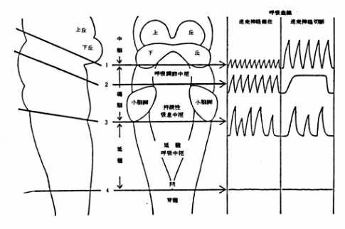 図35−2 脳幹部における断頭と呼吸パターンの変化。呼吸中枢群(Comroe に よる)