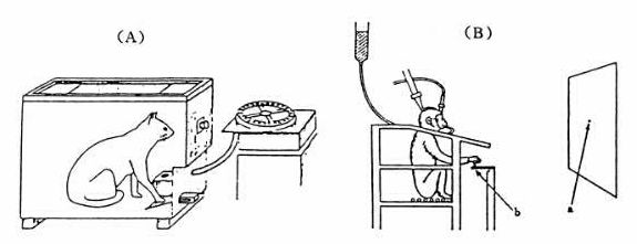 図38−3 結果学習訓練2例。  (A):ネコのオペラント行動訓練。  (B):サルの刺激弁別実験。